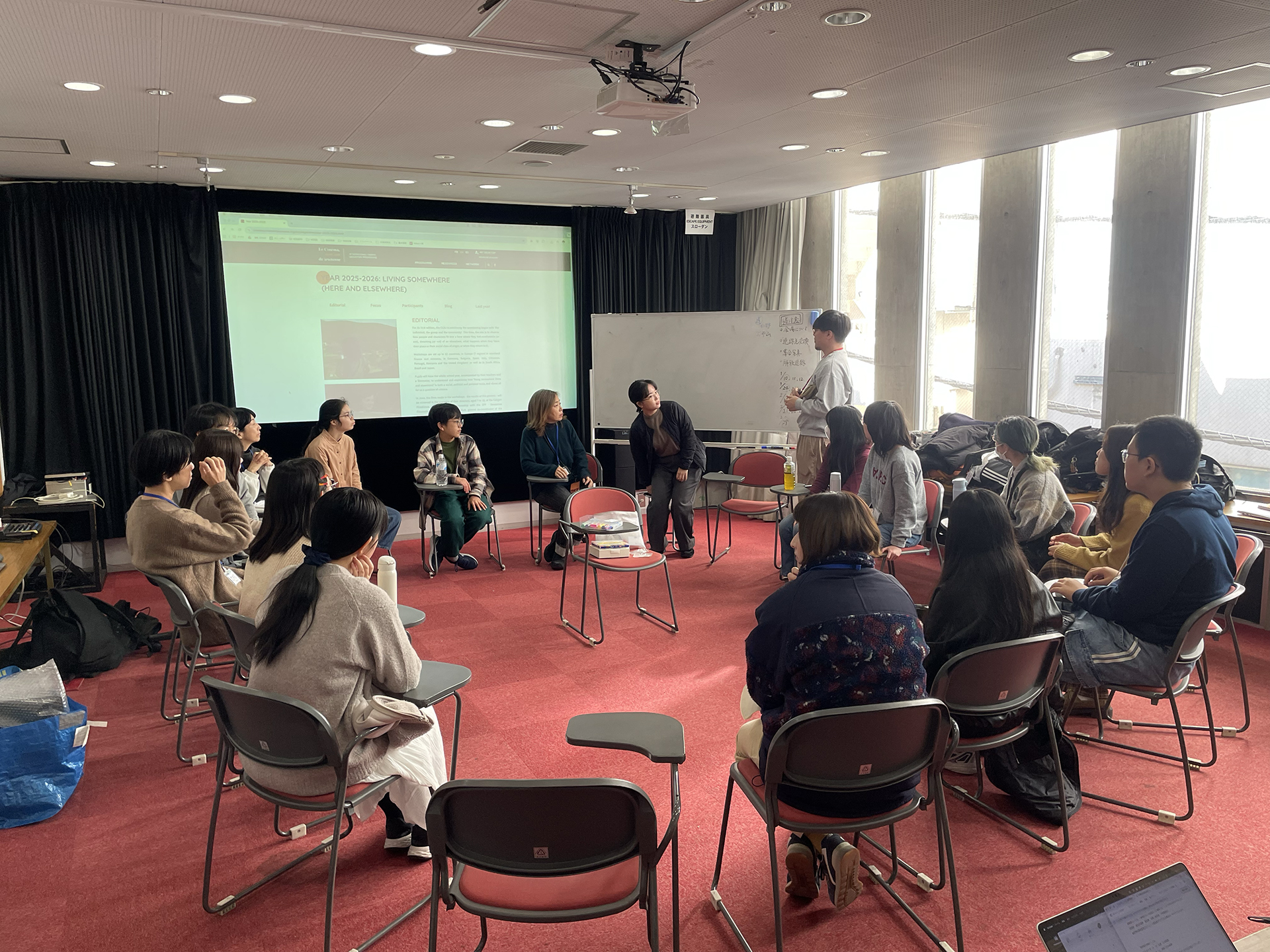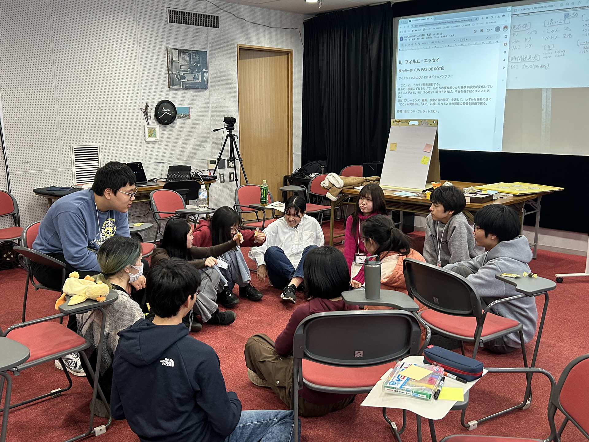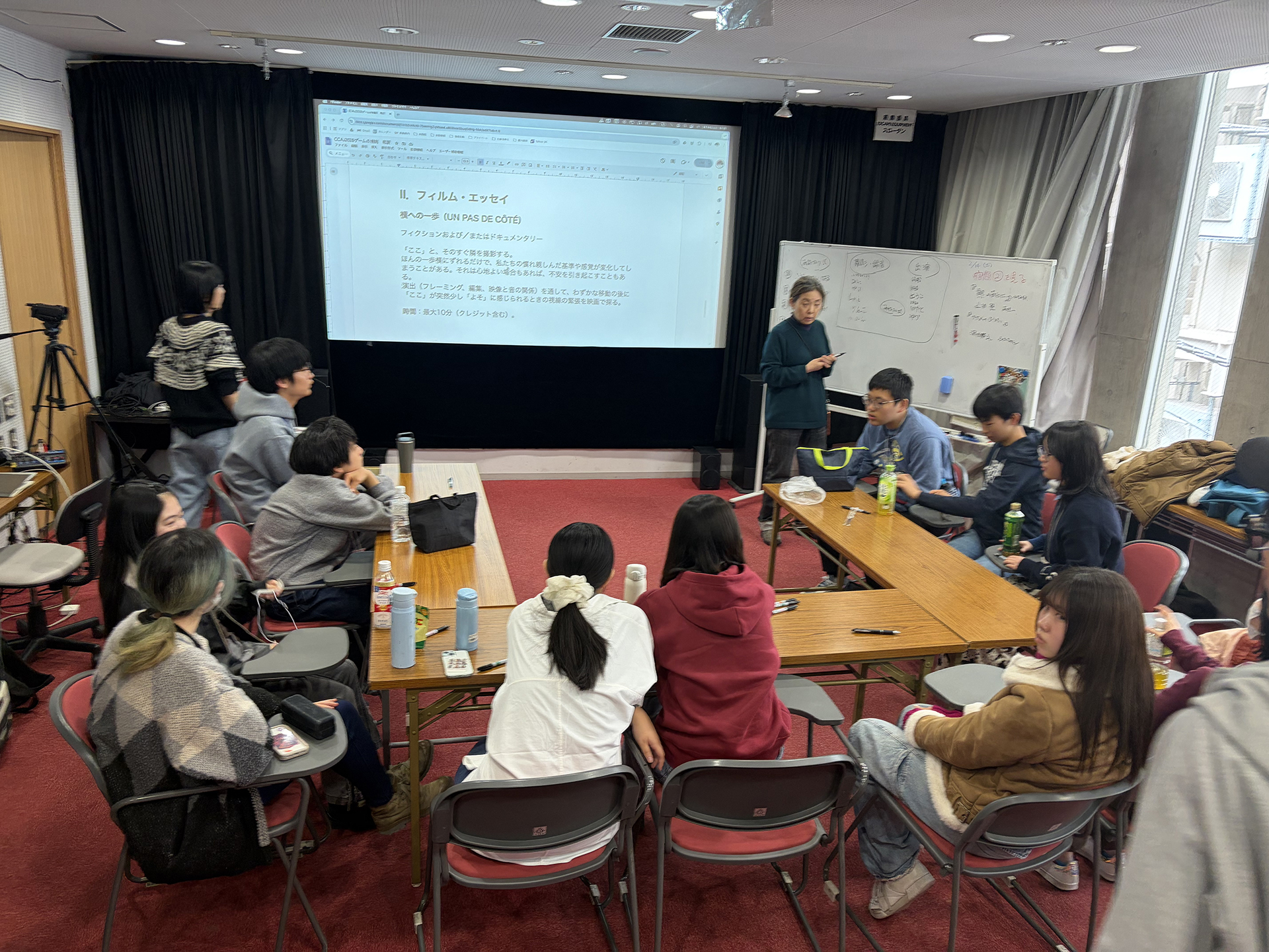 特別講師はちえちゃん(早川千絵監督)です。ちえちゃんが監督した映画『ルノワール』を観てくることと、「私の"ここ"」をテーマに3カットのドキュメンタリーを各自で撮ってくることが今日までの宿題でした。