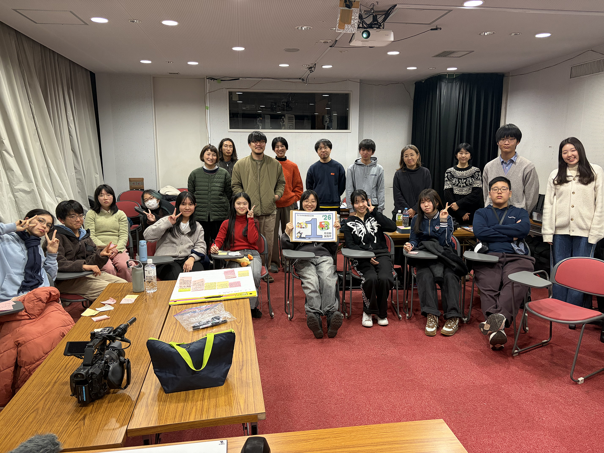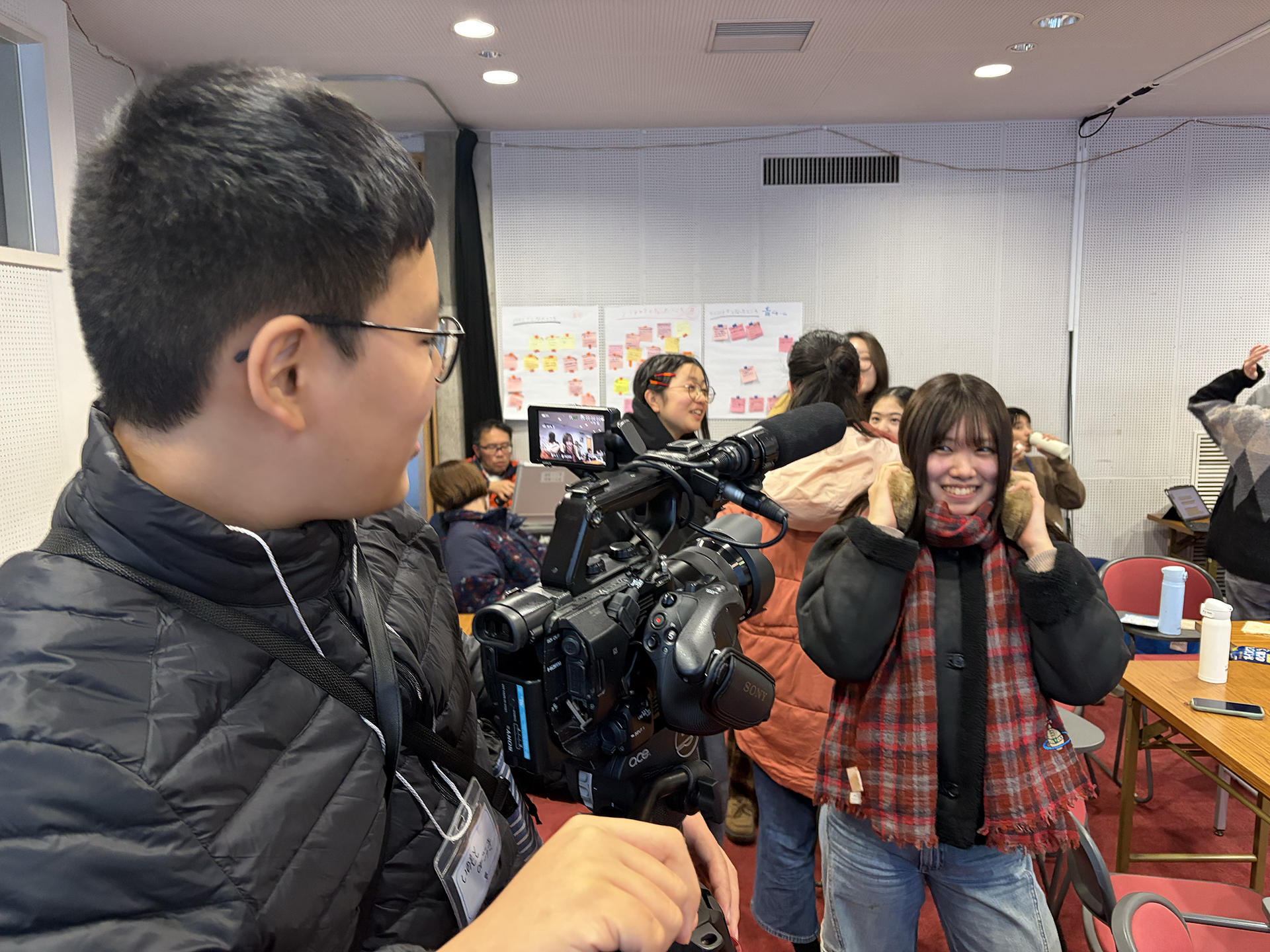 午後にはその設定をもとに、主人公が見知らぬ人と出会うシーンの撮影を行いました。カメラ・マイク・カチンコの役割を交代しながら撮影を進めていきます。全員で一つの作品を作っていく難しさを感じつつも、作品作りは着実に進んでいます。しかし、完成までにはまだまだやるべきことがたくさん!がんばれ〜。