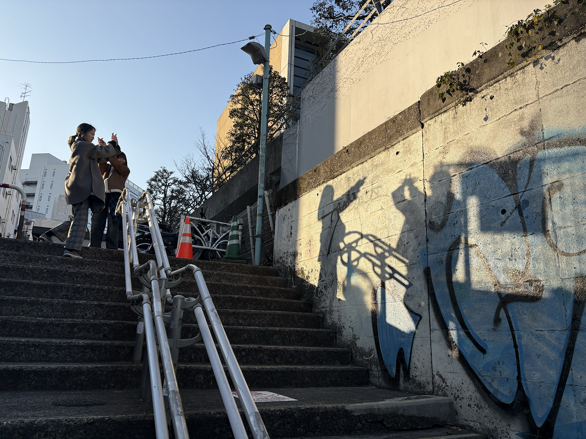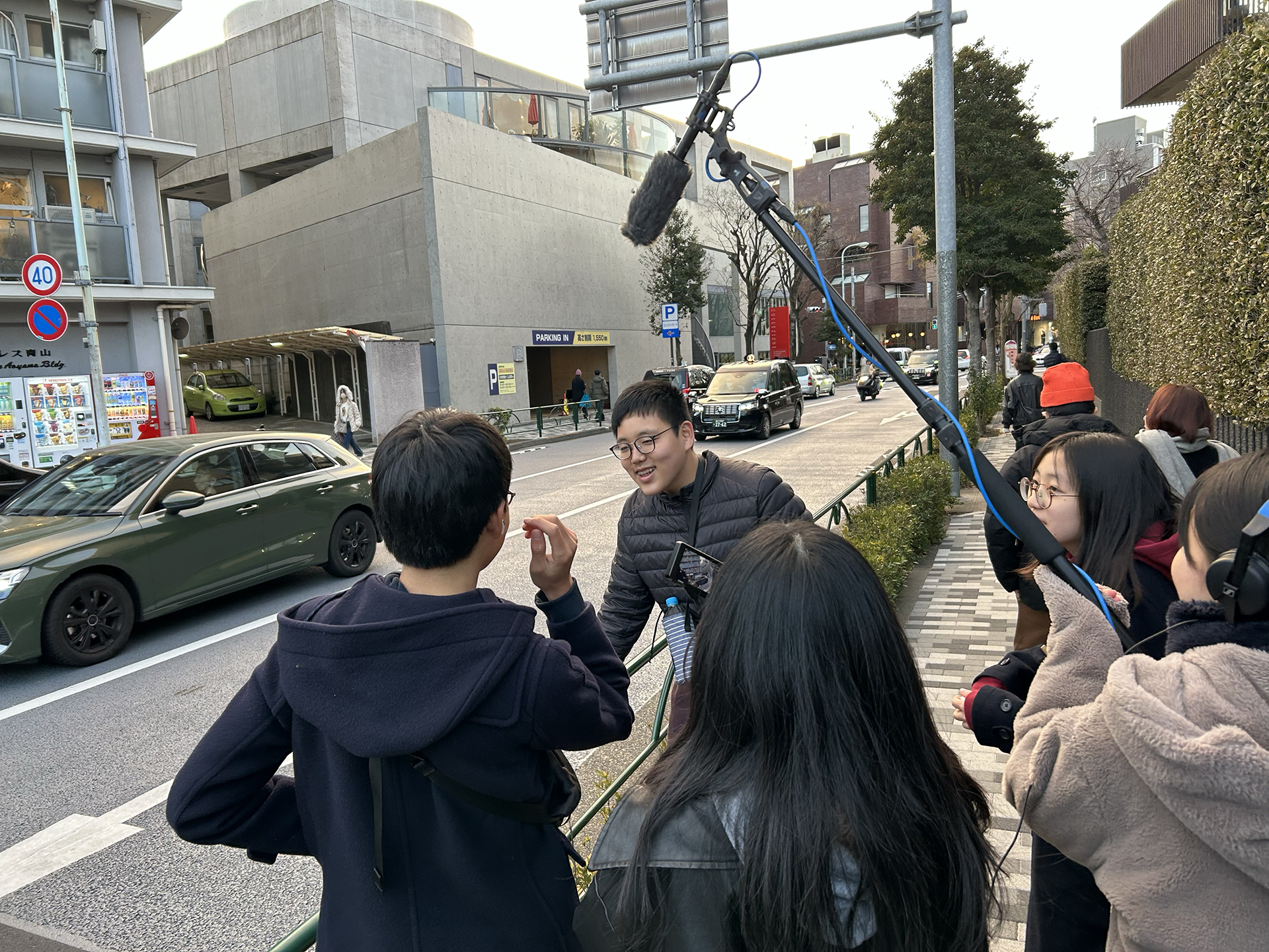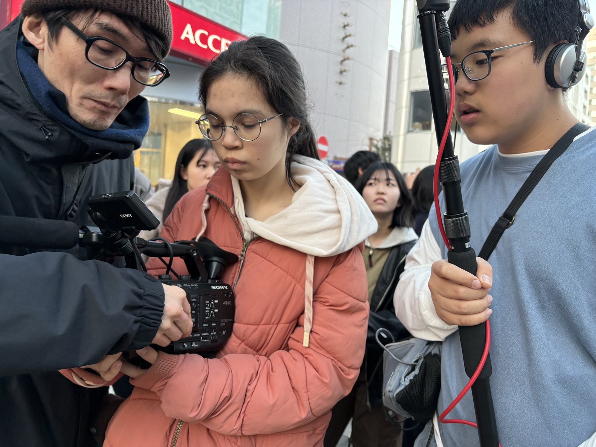 まずロケハンチームの見つけた陸橋の上から下を見下ろすと去っていく友達が人混みに消えていくようでおもしろいということになり、いざ撮影に。去っていくタイミングやピントのズラし方など、何度も工夫して納得のいく撮影ができました。
