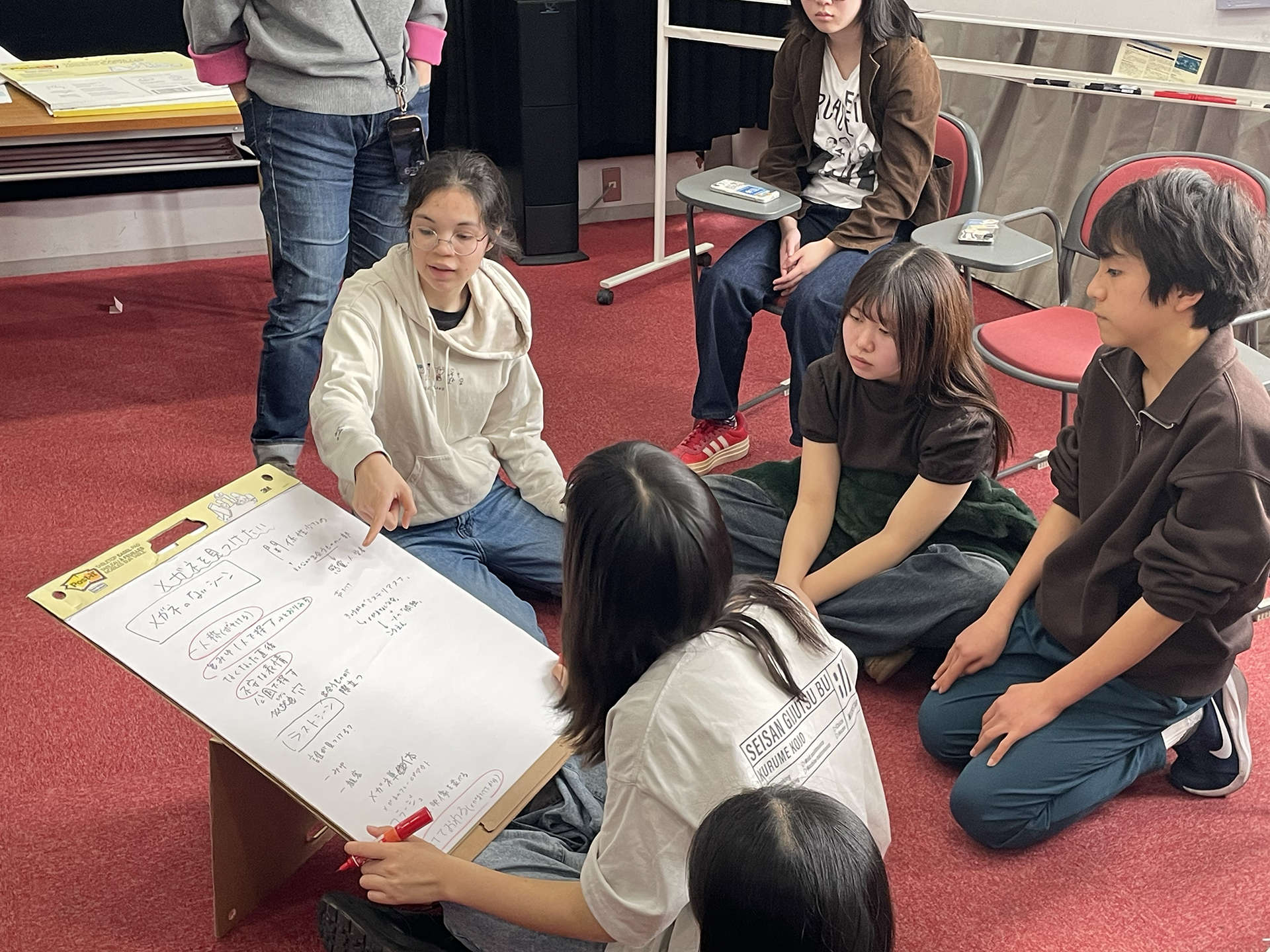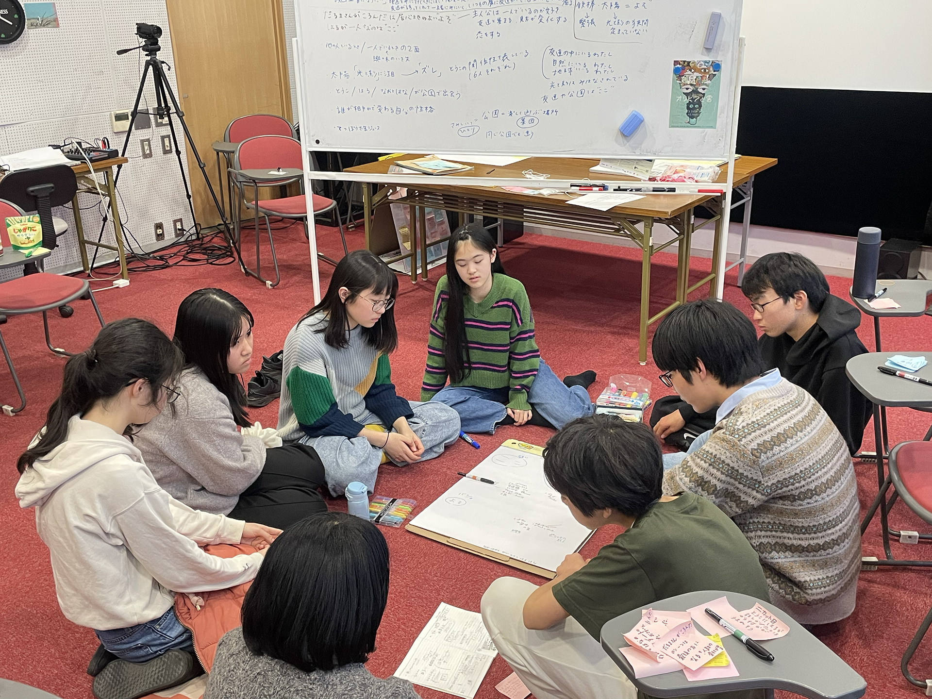 そこで物語を考える班と撮影を進める班に分かれることに。物語班は、この日来てくださった諏訪敦彦監督からもアドバイスをもらいながら、作品全体のストーリーを考えました。さらに主人公の他にもう一人の出演者も決定。