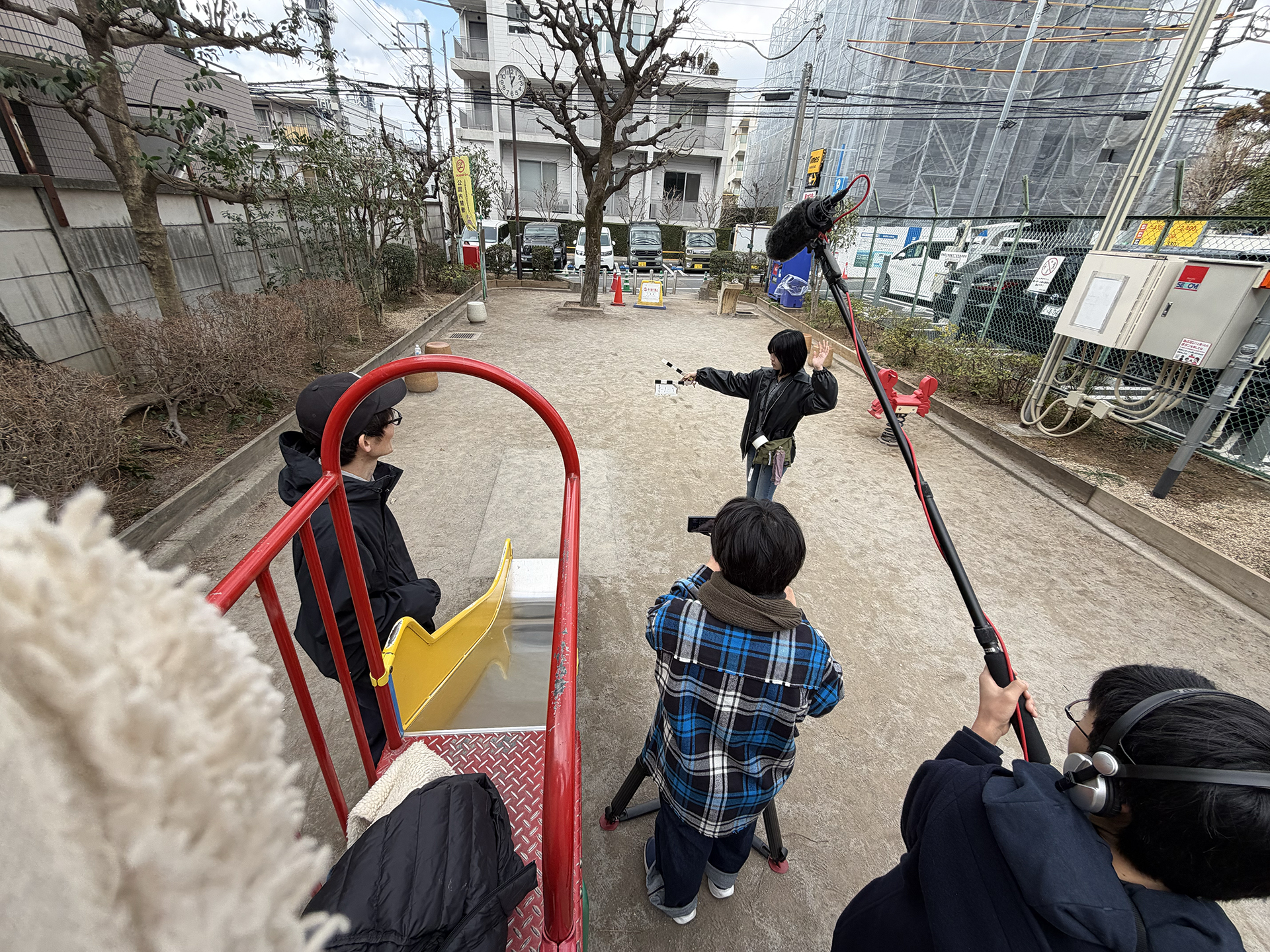その熱い気持ちを維持したまま次は急いで公園へ。お話作りチームが考えてくれた脚本を元にどう動けばいいか芝居を丁寧に練っていきます。終わりの時間が迫る中でも 1 カットずつじっくり考えて公園という空間を存分に活かしたシーンが撮れました!次はいよいよ最終日です!