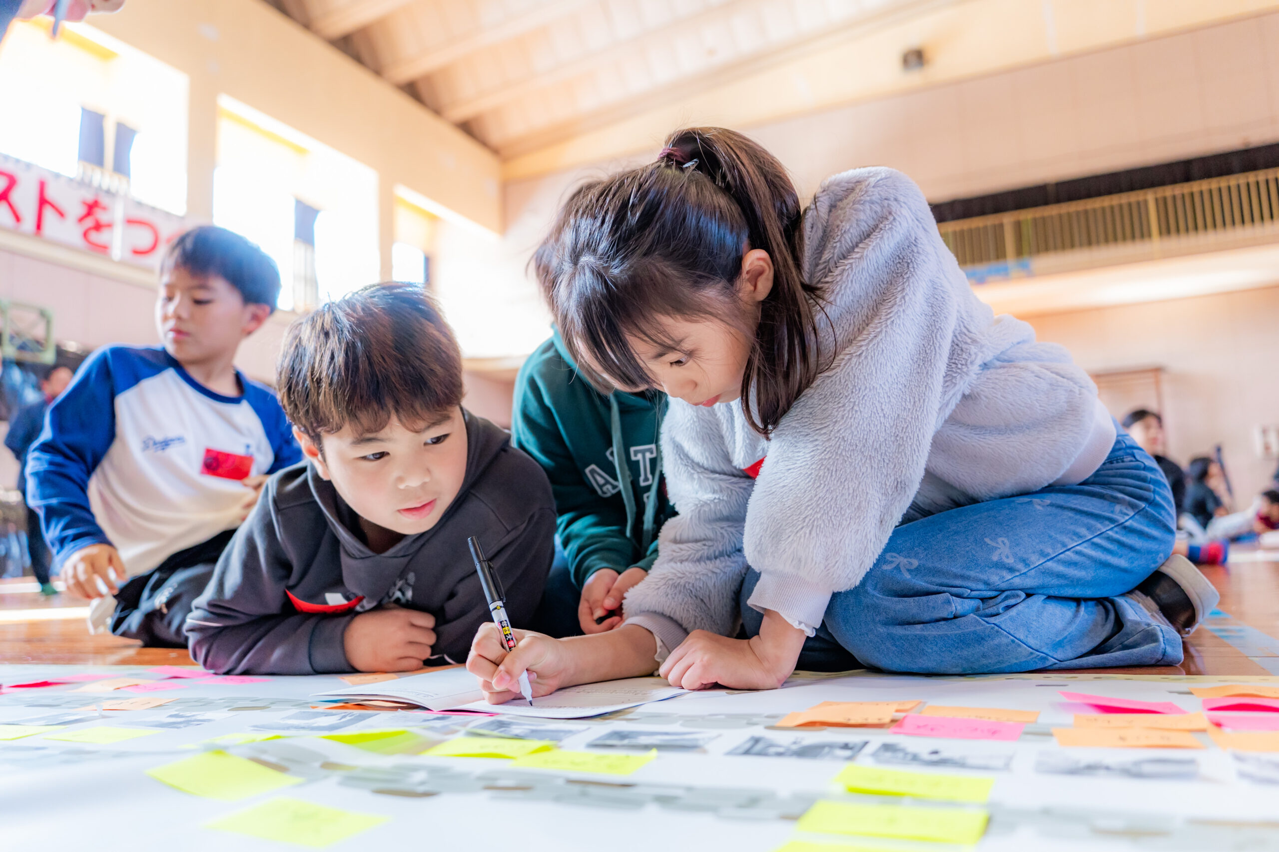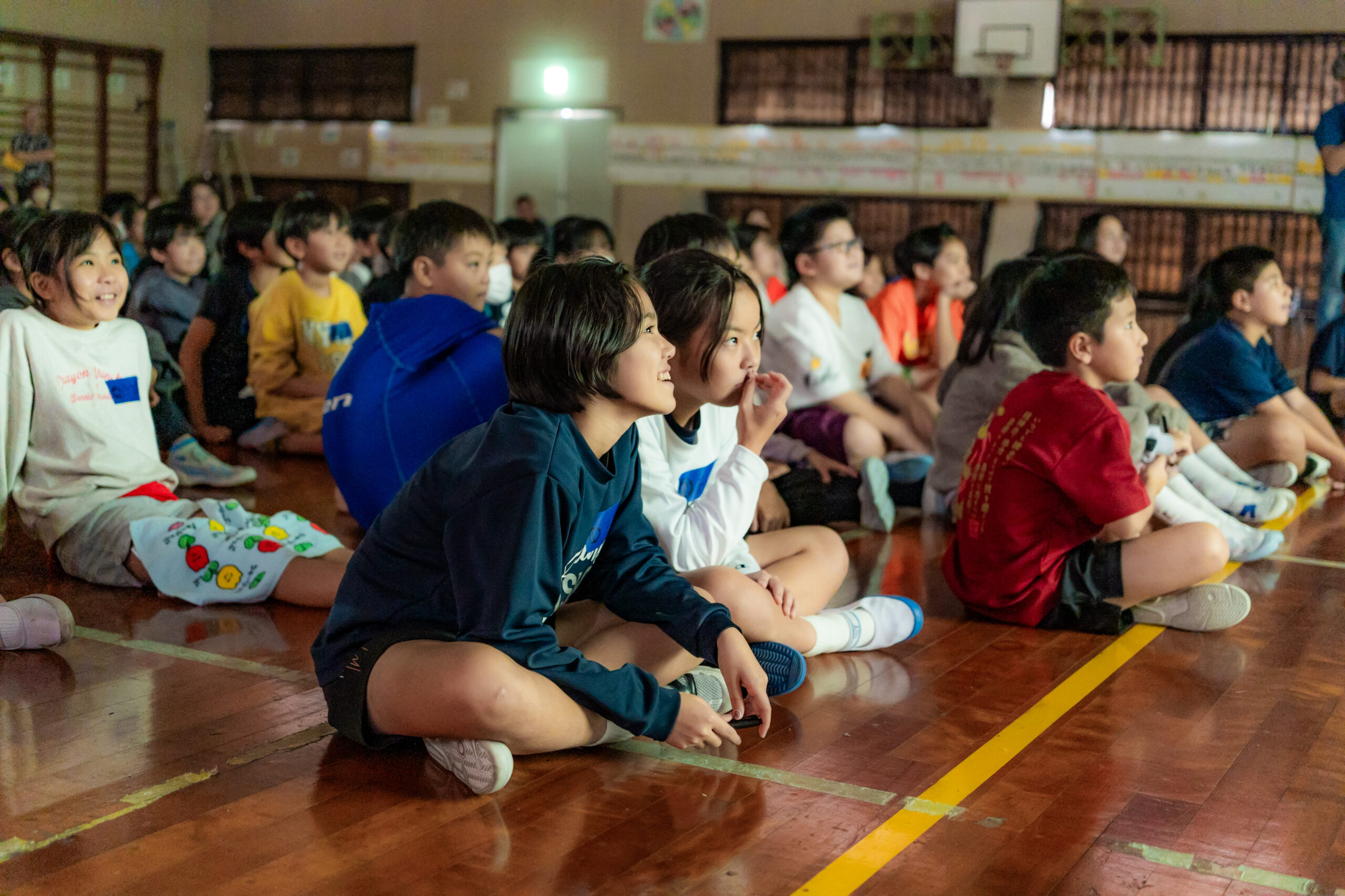 快晴の宮古島で、宮古島市立東小学校の元気な4年生85人と鑑賞+制作ワークショップを行いました。