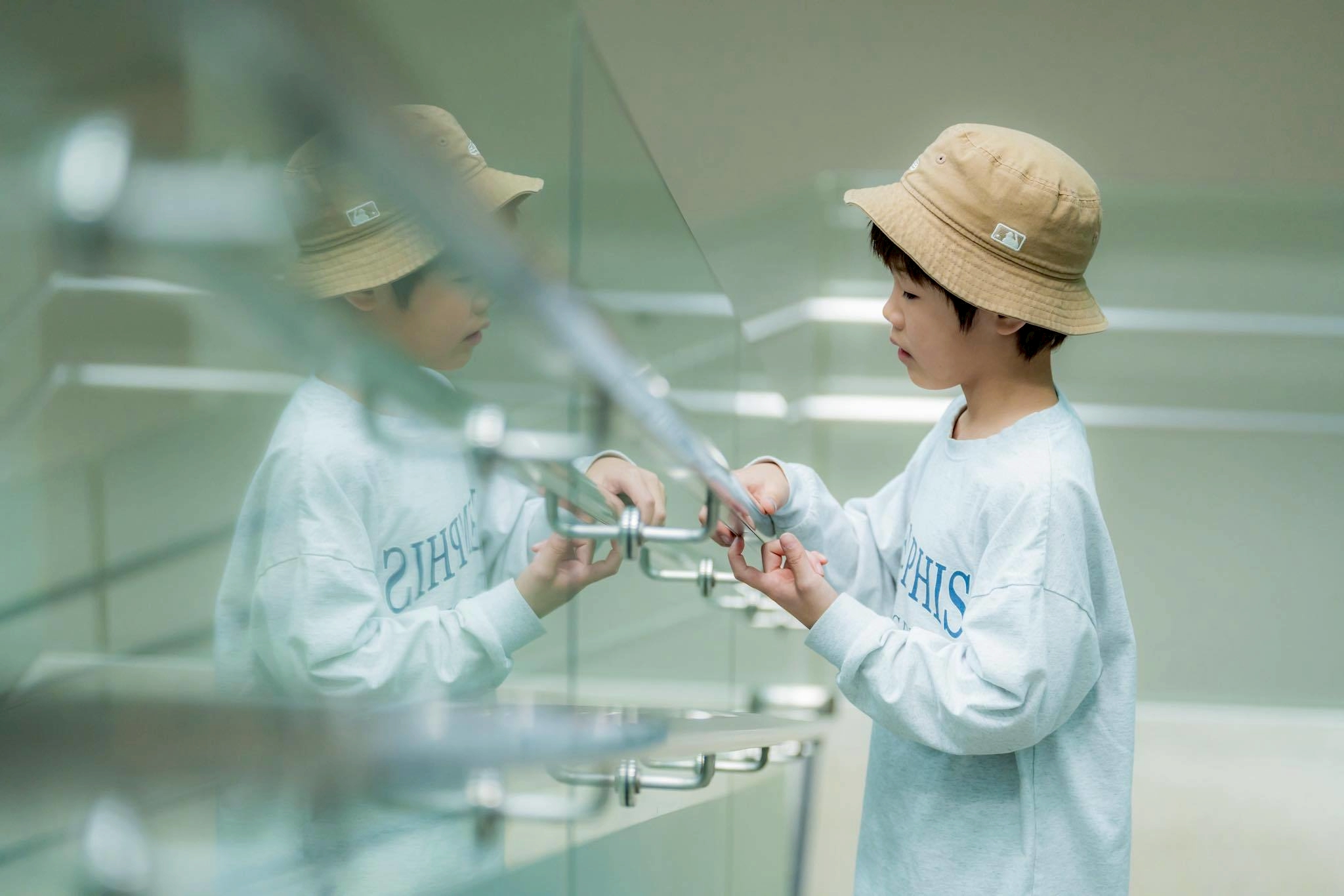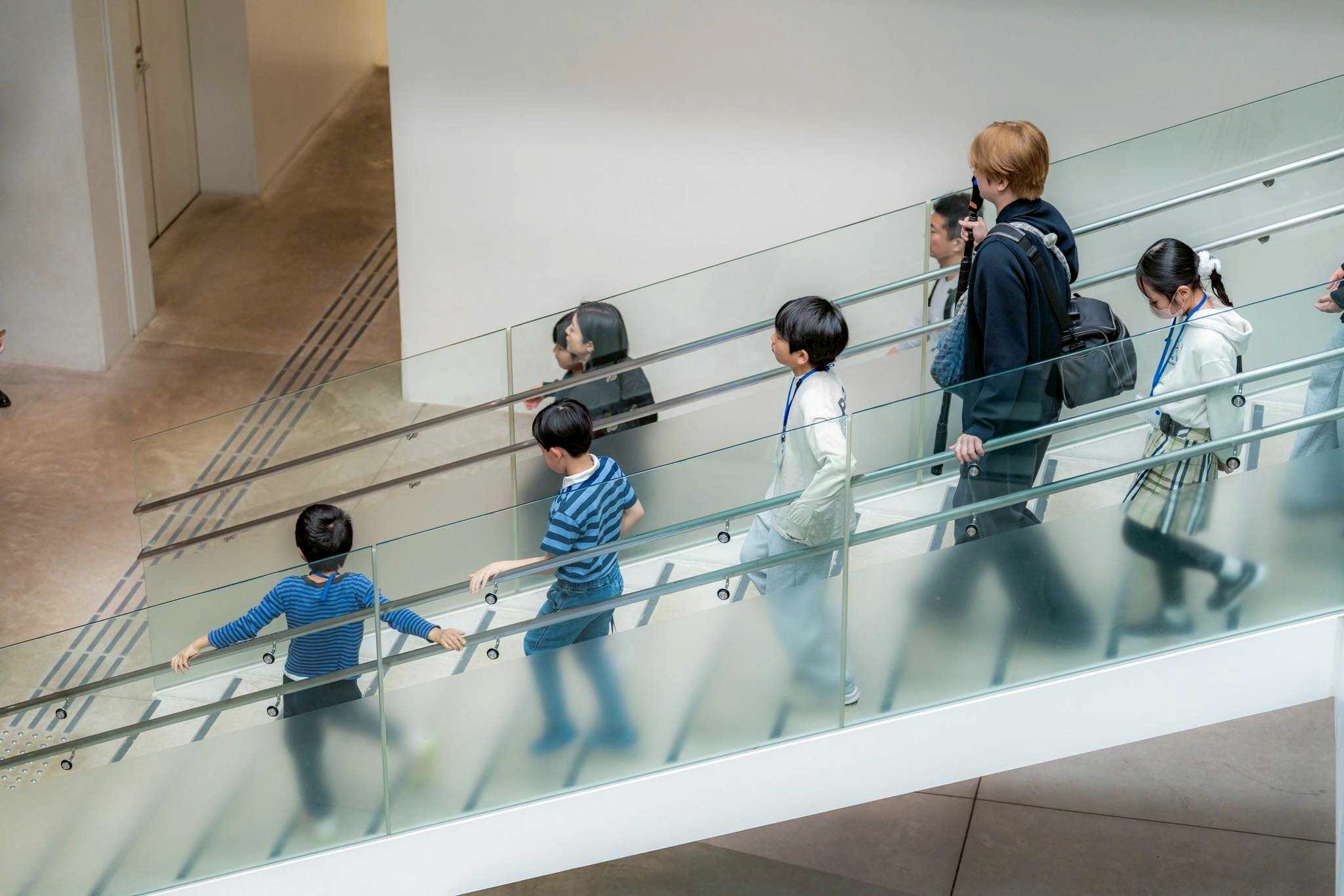 「それぞれが気になる場所で、じっと立っている人を10秒間撮影する」ワークで、1人ひとつづつ撮影するために外に出てました。面白い木や美術館のエレベーターなどを撮影をしていく内に、あっという間に時間が過ぎていきます。そんな中、こどもたちで順番を決めたり撮影を協力しあって、自然とひとつのチームにまとまって機材の扱い方にも慣れていきました。