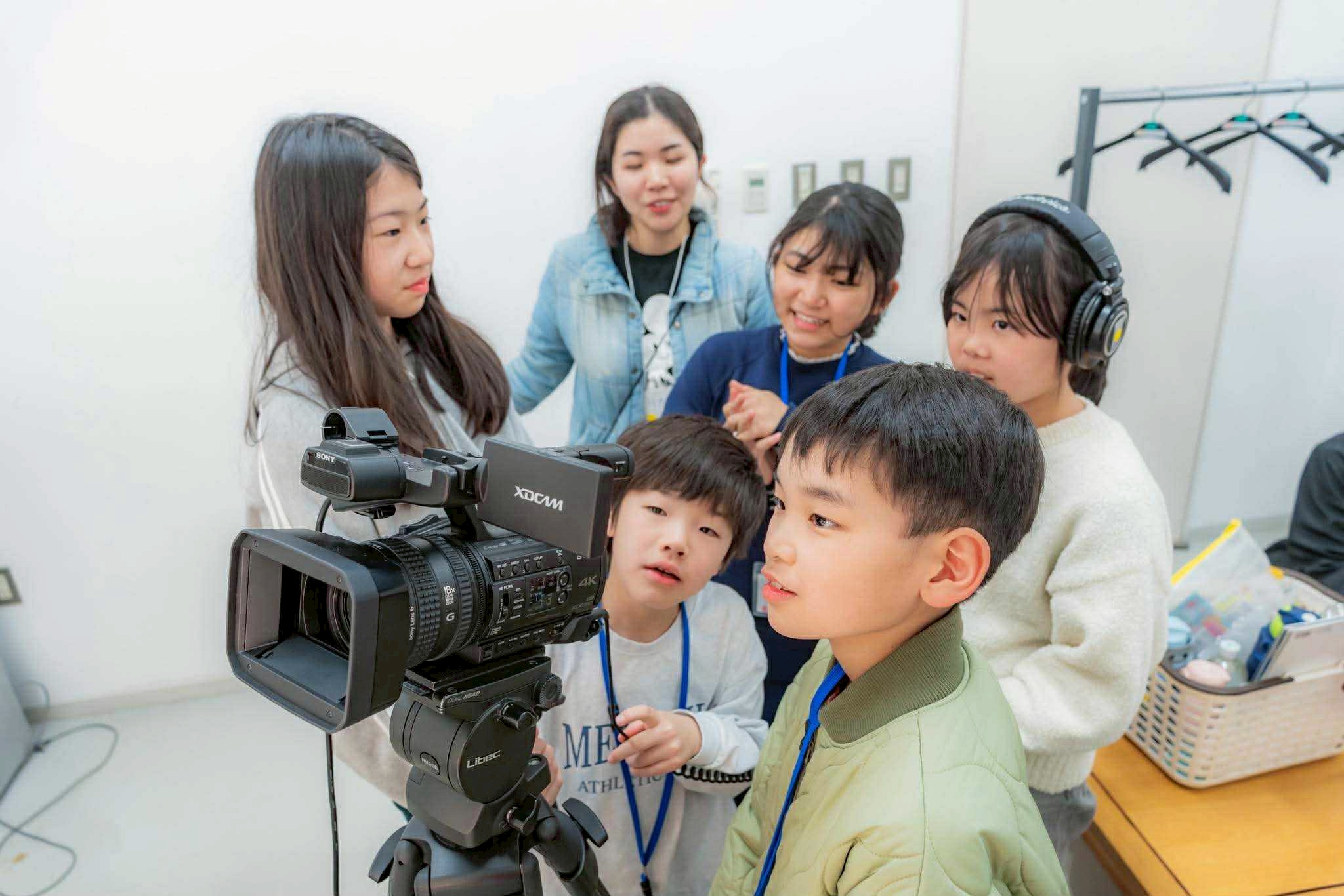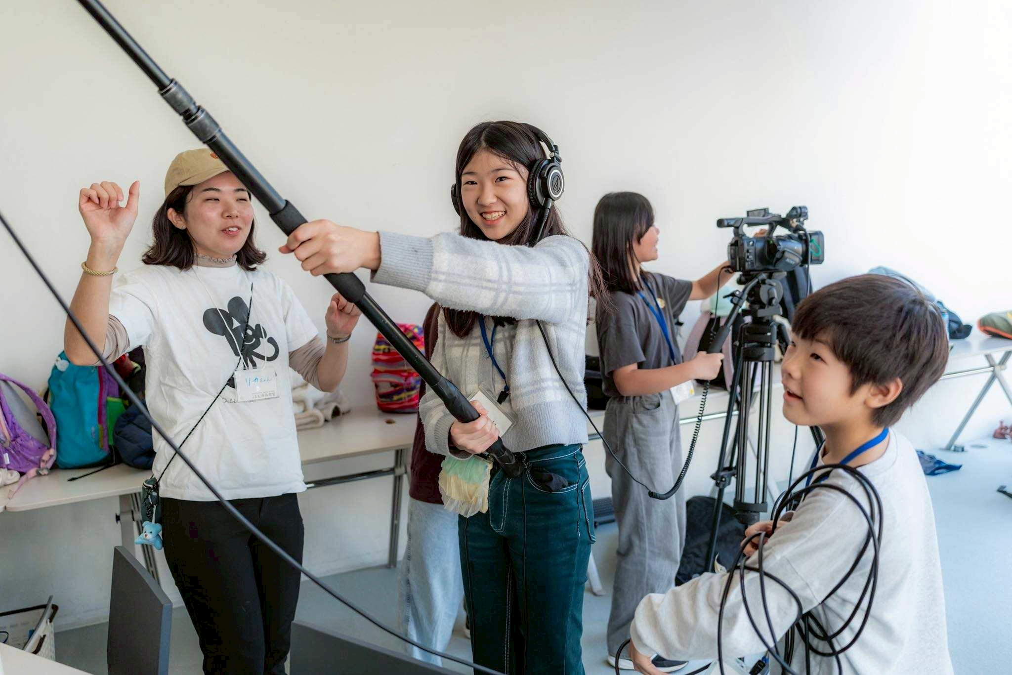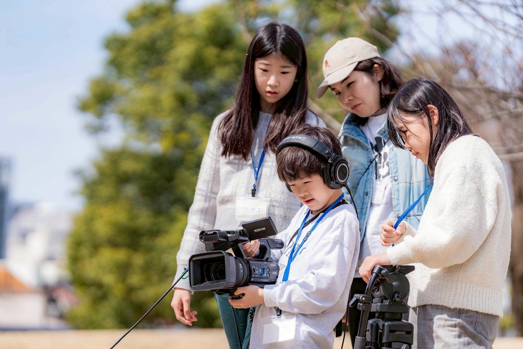 スタッフ紹介とアイスブレイクで心と体がほぐれた後は、みんなで外に出て映画の準備体操。自分自身がカメラとマイクになり、手でフレームを作って近づいたり離れたりしてどう観えるのか、目を閉じて耳に手を当ててどんな音が聞こえるのかを体感しました。それから美術館に戻ってチームで集まり、実際に機材を触ってみます。プロが使う大きくて重いカメラを1人づつ体験し、マイクや三脚の扱い方も教えてもらいいざ撮影開始です。