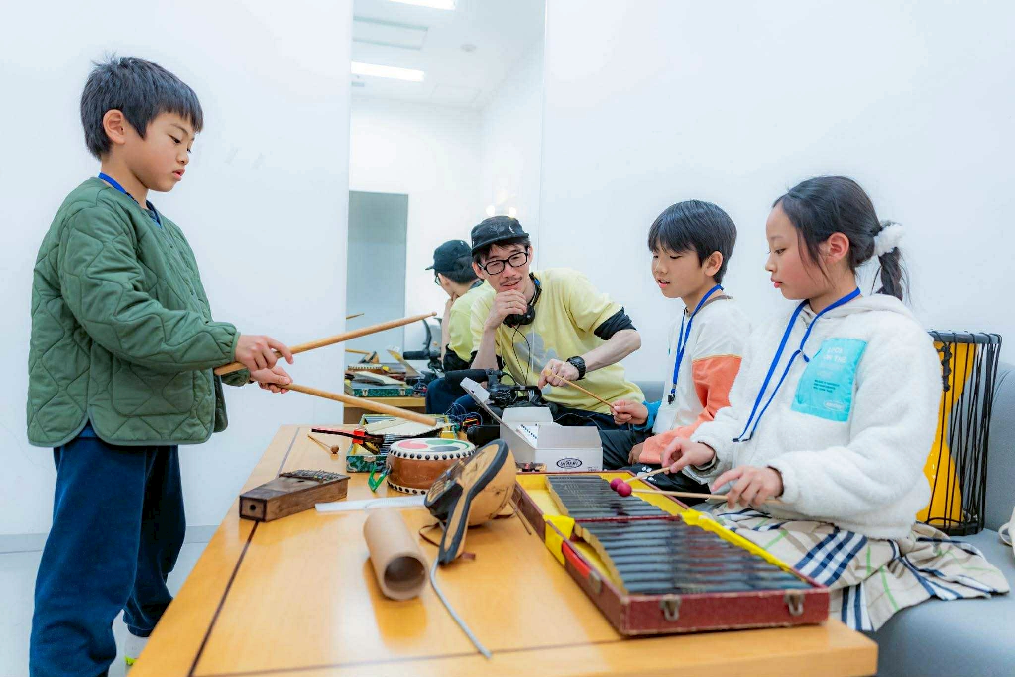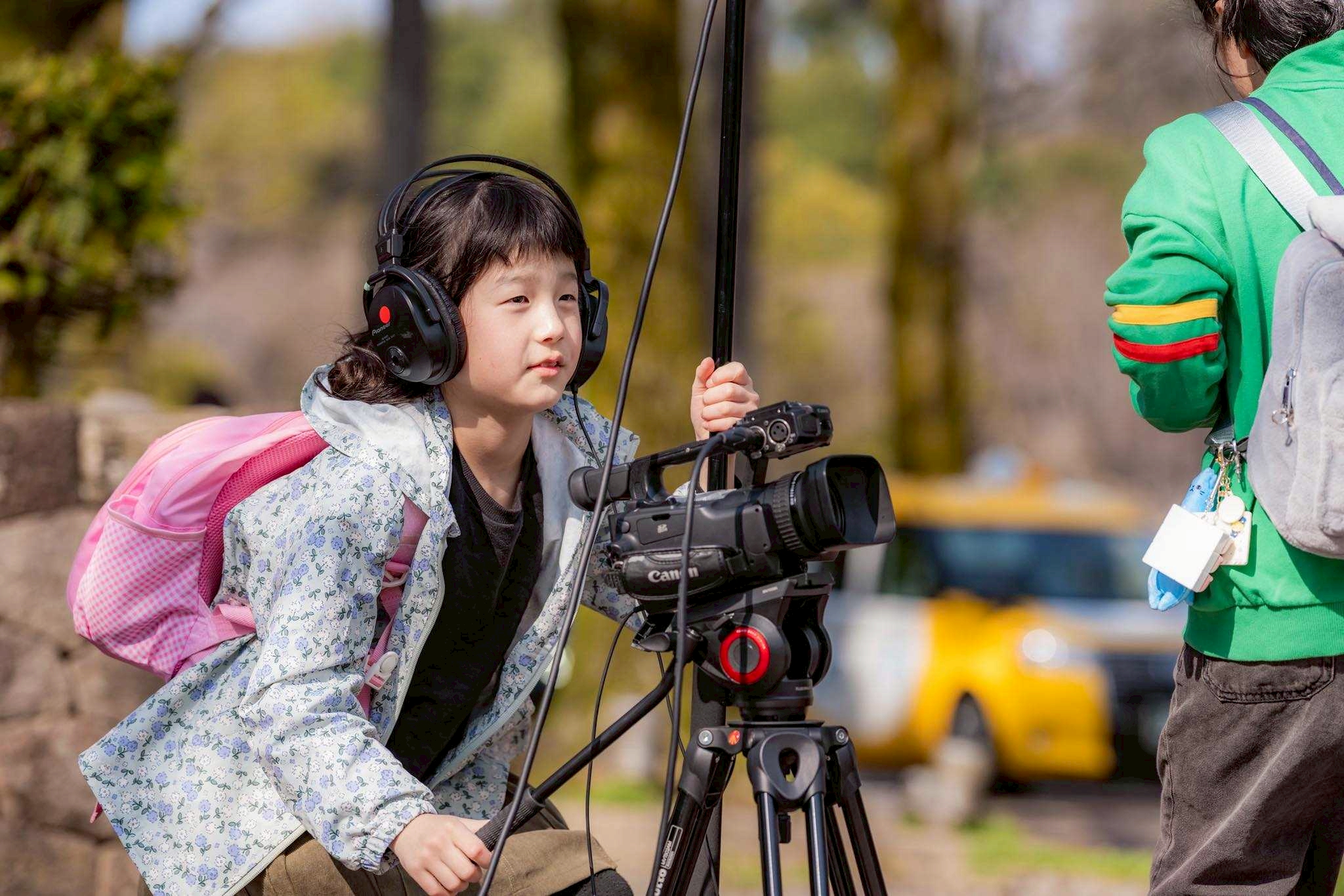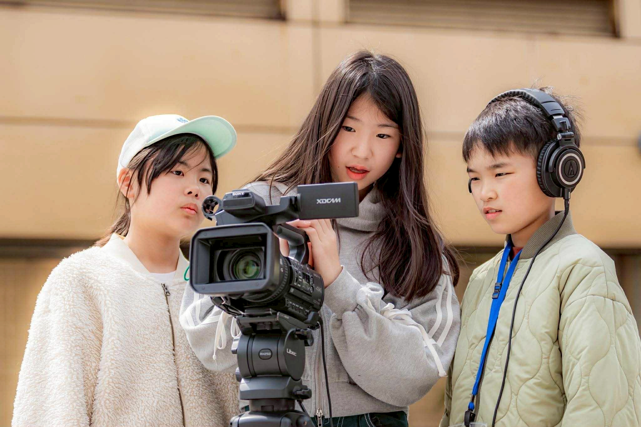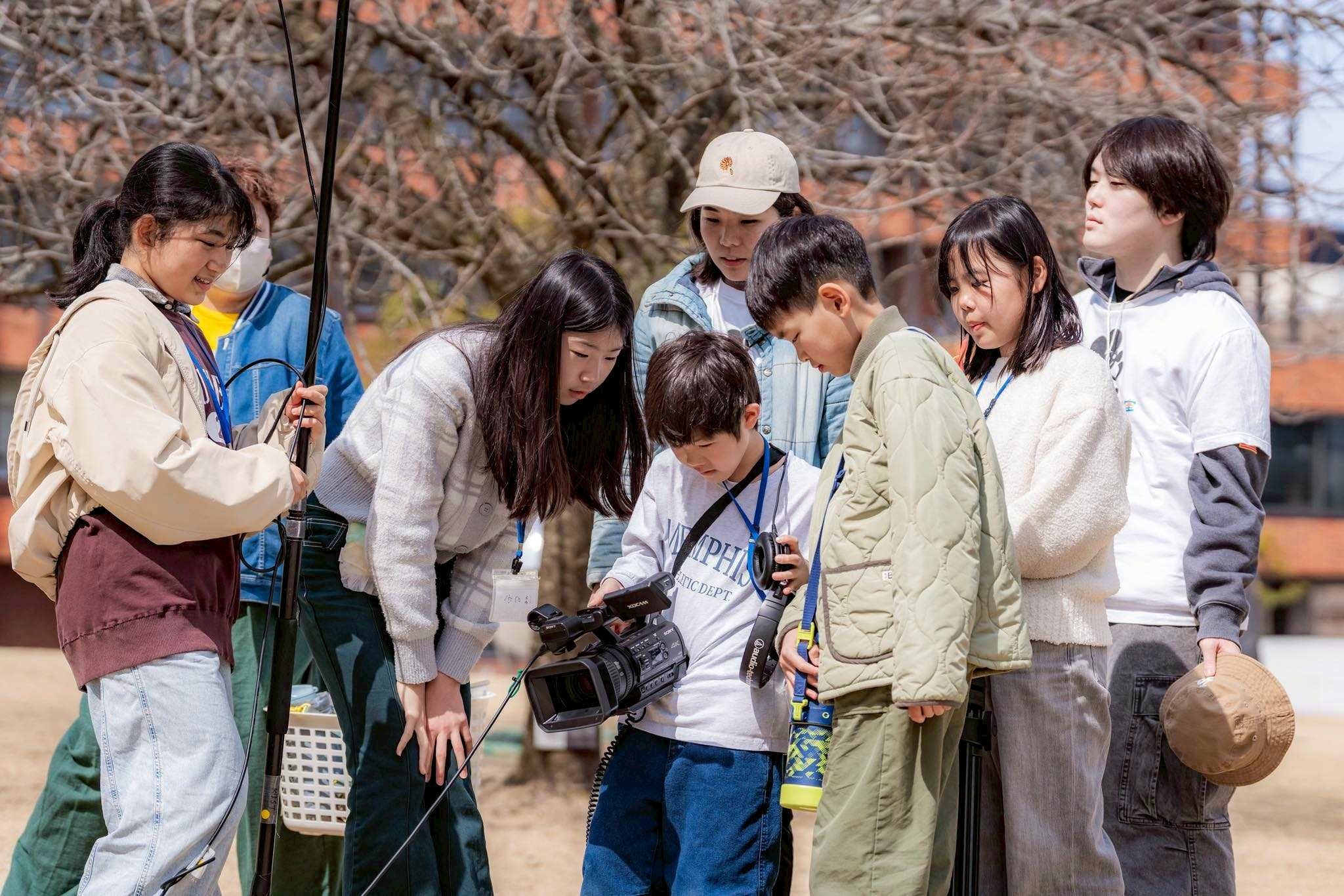 スタッフ紹介とアイスブレイクで心と体がほぐれた後は、みんなで外に出て映画の準備体操。自分自身がカメラとマイクになり、手でフレームを作って近づいたり離れたりしてどう観えるのか、目を閉じて耳に手を当ててどんな音が聞こえるのかを体感しました。それから美術館に戻ってチームで集まり、実際に機材を触ってみます。プロが使う大きくて重いカメラを1人づつ体験し、マイクや三脚の扱い方も教えてもらいいざ撮影開始です。
