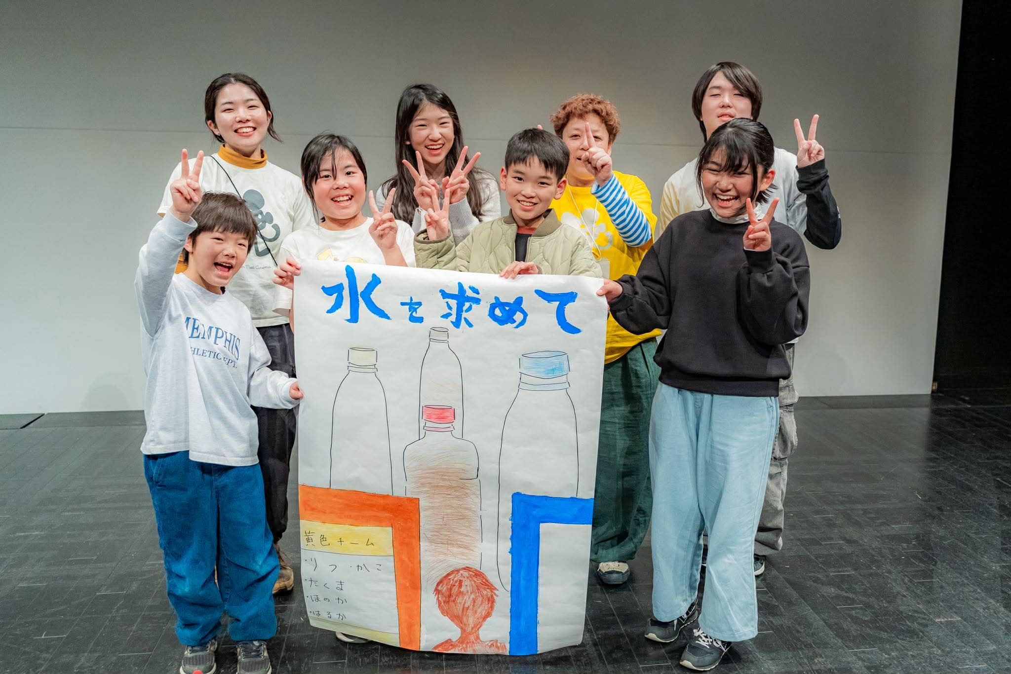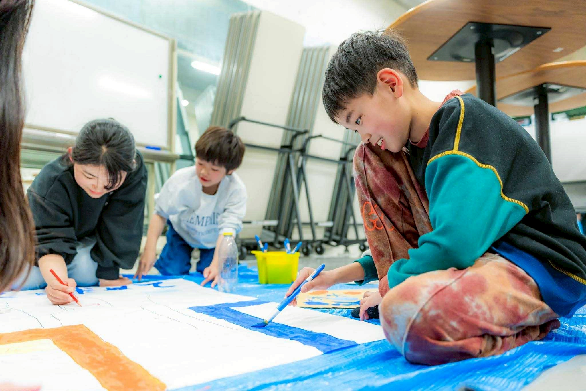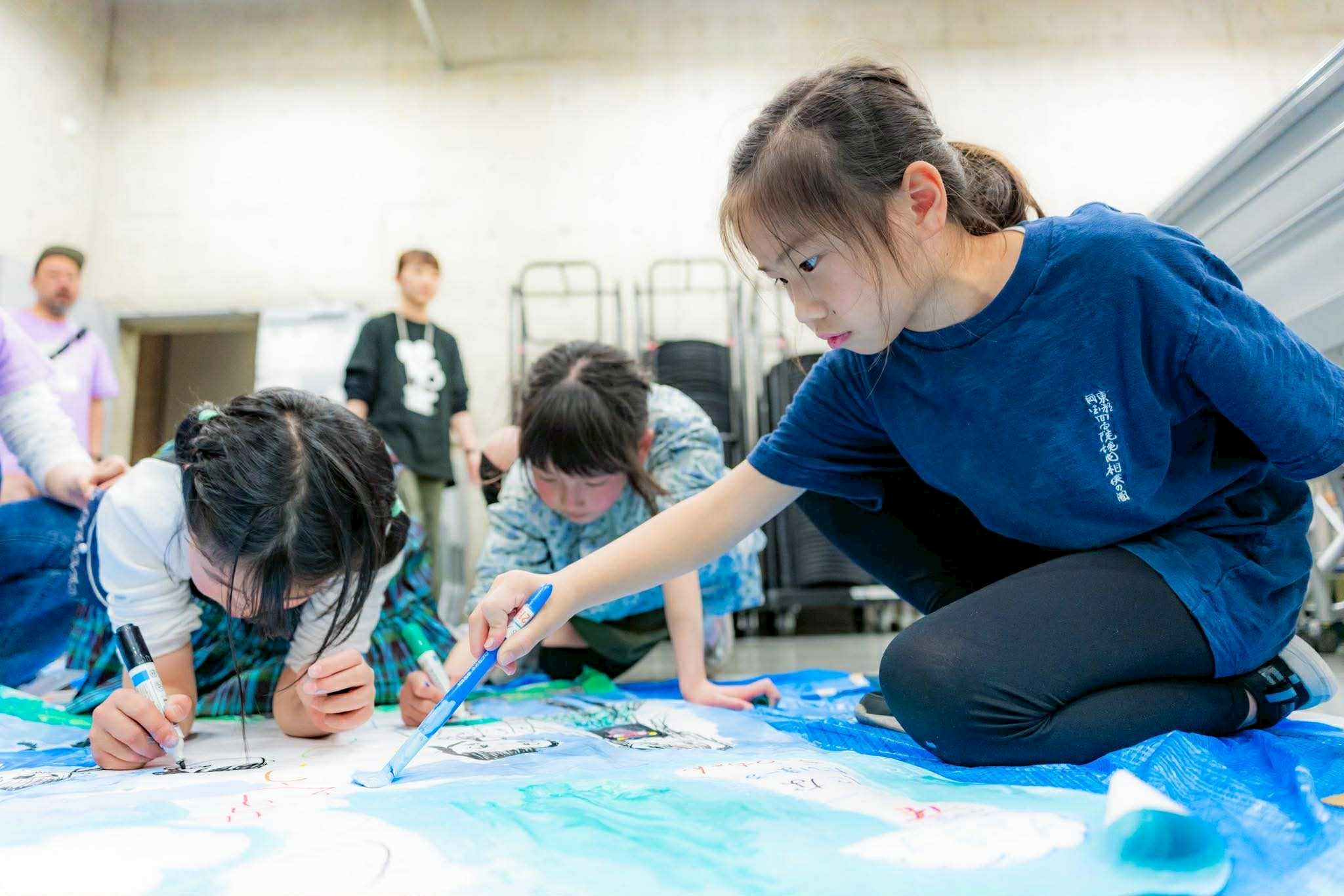 午後は2チームに分かれて作業を進めていきます。女子チームはポスター作り。午前の撮影で何度も走りまわったため、へとへとになっているにも関わらず、ペンと絵の具を使って大きな画用紙に絵を書いていきます。3日間を通してほっぺを触り合うまで仲良くなれた3人が協力してとても素敵なポスターを作ってくれました。